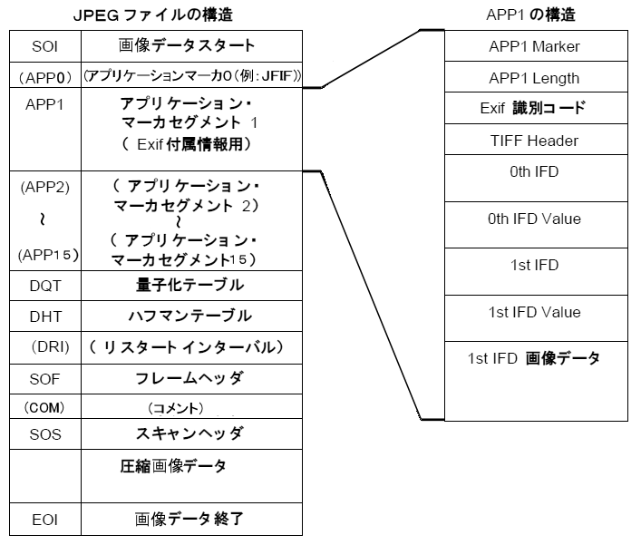 ExifではJpegフォーマットのアプリケーション・マーカセグメント1(APP1)を利用してデータが記録されている。これを図示すると以下のようであるが、APP2以降の例にはadobe(APP13)などがある。なお、Exif規格ではAPP2はフラッシュピクス用に使用されることとなっている。
