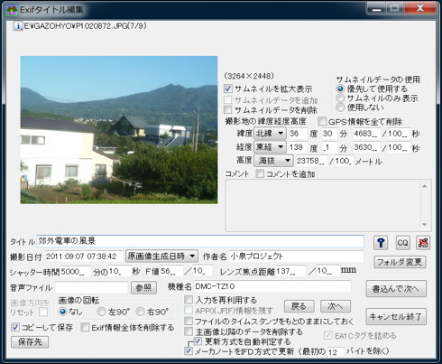 JPEG形式の画像ファイル(ビットマップ形式、GIF形式等の画像はJPEG形式に変換して)に標題や撮影日時、シャッター時間などの撮影情報をExif形式で付加、編集、削除するもので、フォルダ単位でファイルを連続的に処理できます。撮影地の緯度経度も追加、編集できるので、現状ではGPS情報を自動記録できるデジタルカメラは稀ですが、別途GPSロガーを携行して、後からGPSログを参照して画像にGPSデータを入力する事にも使用できます。 Exif情報の編集は画像情報には一切手を加えないので何度書き直してもJPEG画像の劣化が全くありません。他への影響があまりなくExif情報を編集できるソフトは他にはあまり見あたらないと思います。そのほか、ファイル情報として、Exif情報の詳細とJpegマーカセグメント情報の概要も確認することができます。
