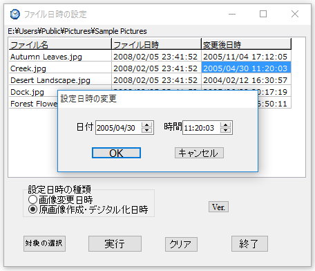 Exifの日時情報のうち、「画像変更日時」と「原画像作成日時」(「デジタル化日時」)のどちらに合わせるかを選択可能。また。手動による設定も可能なのでExif情報を持たないものでも、タイムスタンプを任意の日時に変更できる。